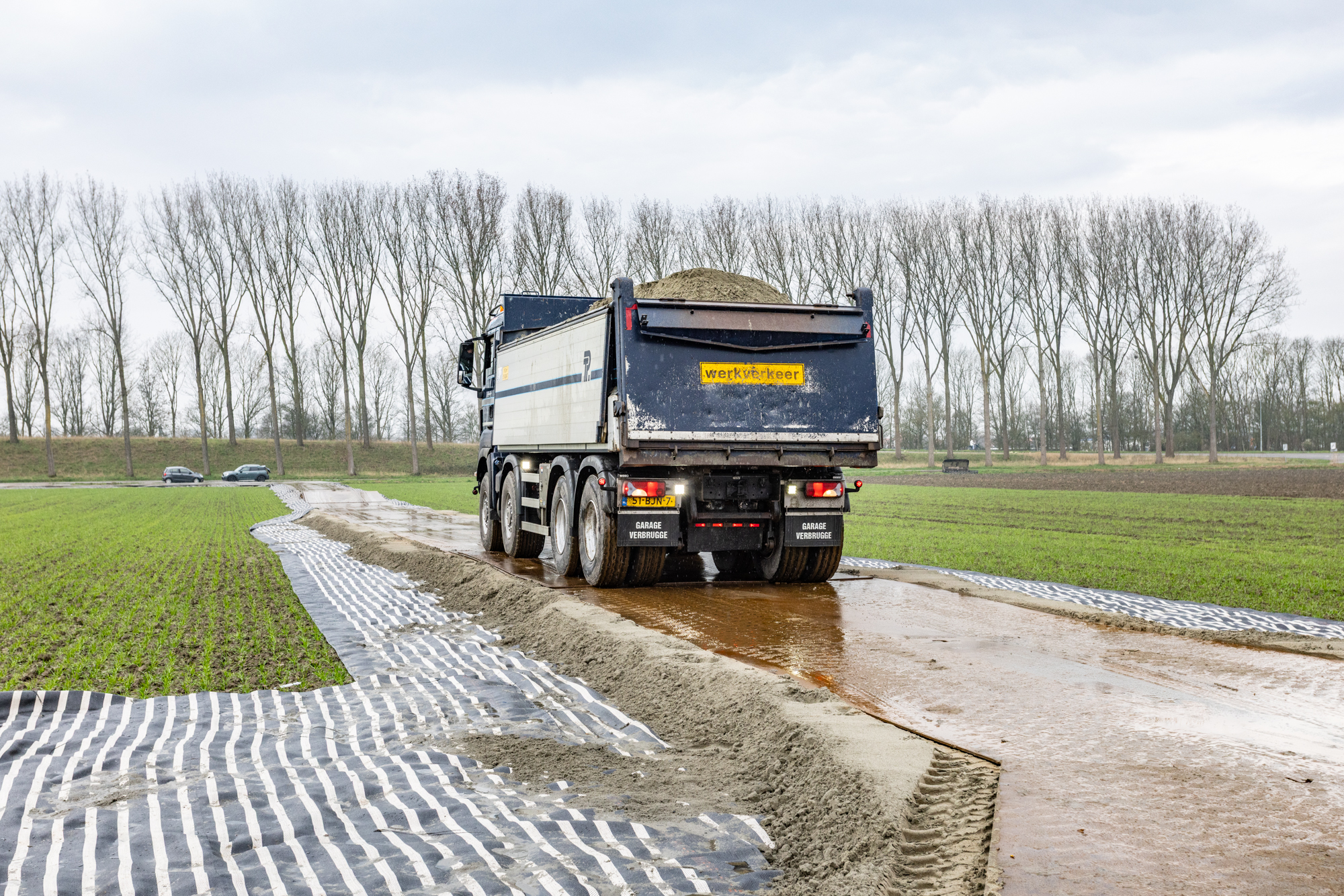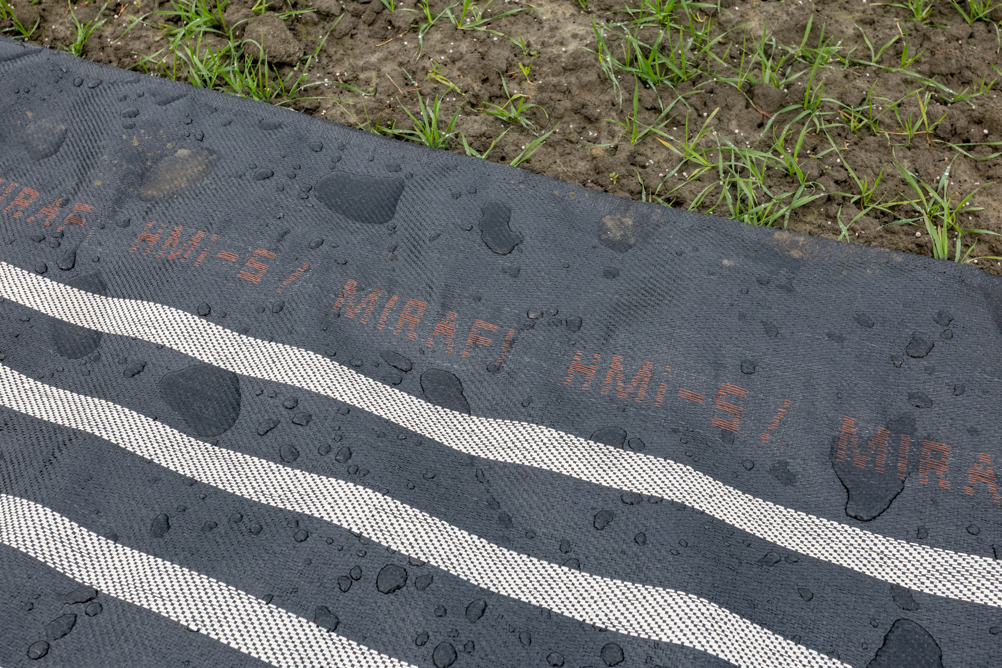 Om de ondergrond te scheiden en te verstevigen wordt drukverdelend MIRAFI® Geolon HMi-5 geotextiel van Solmax aangebracht. HMi‑5 is een zeer stijf, geweven polypropyleen geotextiel voor ondergrondstabilisatie en funderingswapening. Het levert hoge treksterkte bij zeer lage rek (2–5%) en heeft een stijfheid van ca. 1100 kN/m. Op het geotextiel wordt een funderingslaag van zand aangebracht. De funderingslaag wordt op z’n plaats gehouden en opgesloten door het geotextiel om te slaan. Als laatste wordt de funderingsconstructie afgedekt met rijplaten. Het resultaat is een draagkrachtige, zettingsarme en direct belastbare funderingsconstructie.